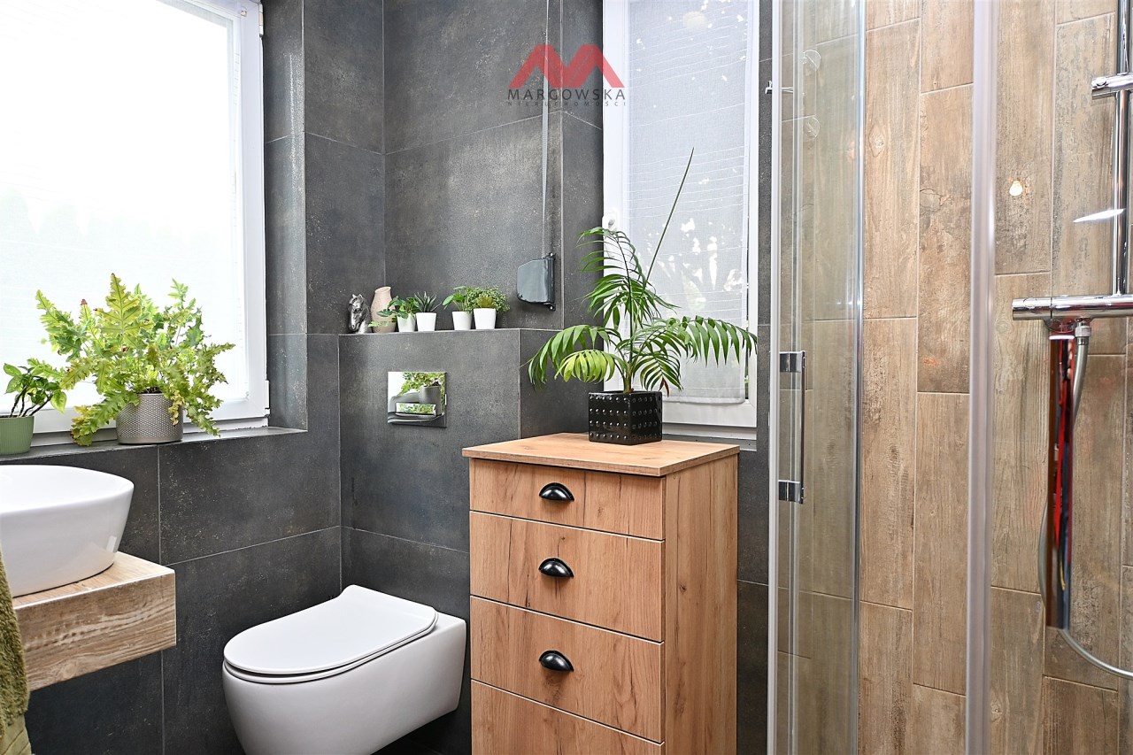 - Łazienka (ok. 4m²) z natryskiem i wc. W łazience dwa okna