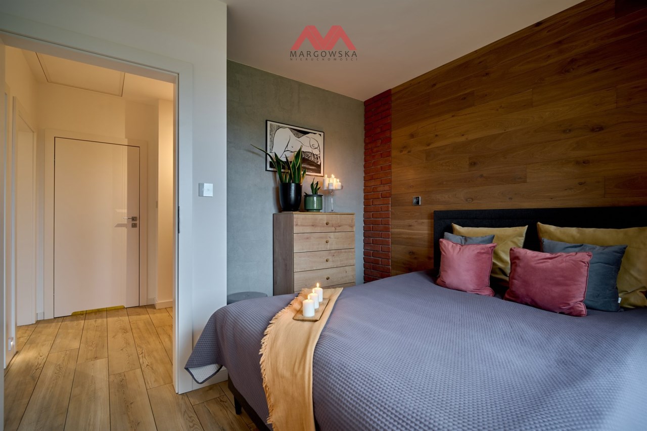 Sypialnia główna (10,10 m2) z wyjściem na ogród, łóżko sypialniane z tapicerowanym wezgłowiem i ścianą wykończoną naturalnym drewnem olejowanym oraz cegłą (łózko, materac, stolik w cenie)