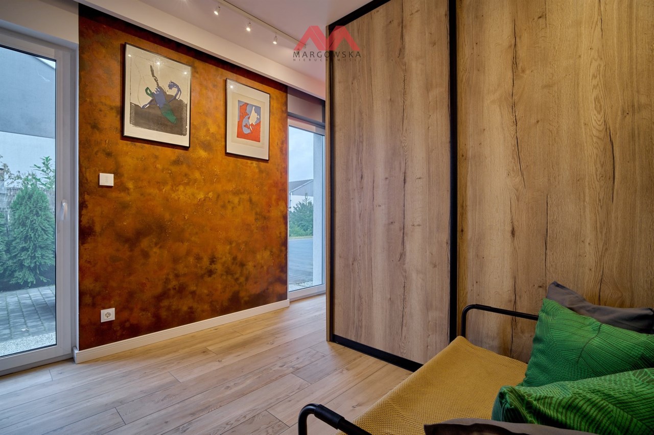 Gabinet (10,20 m2) z wyjściem na ogród, wyposażony w biurko, kanapę z funkcja spania, witryny, szafki wiszące i oświetlenie (wszytsko w cenie)