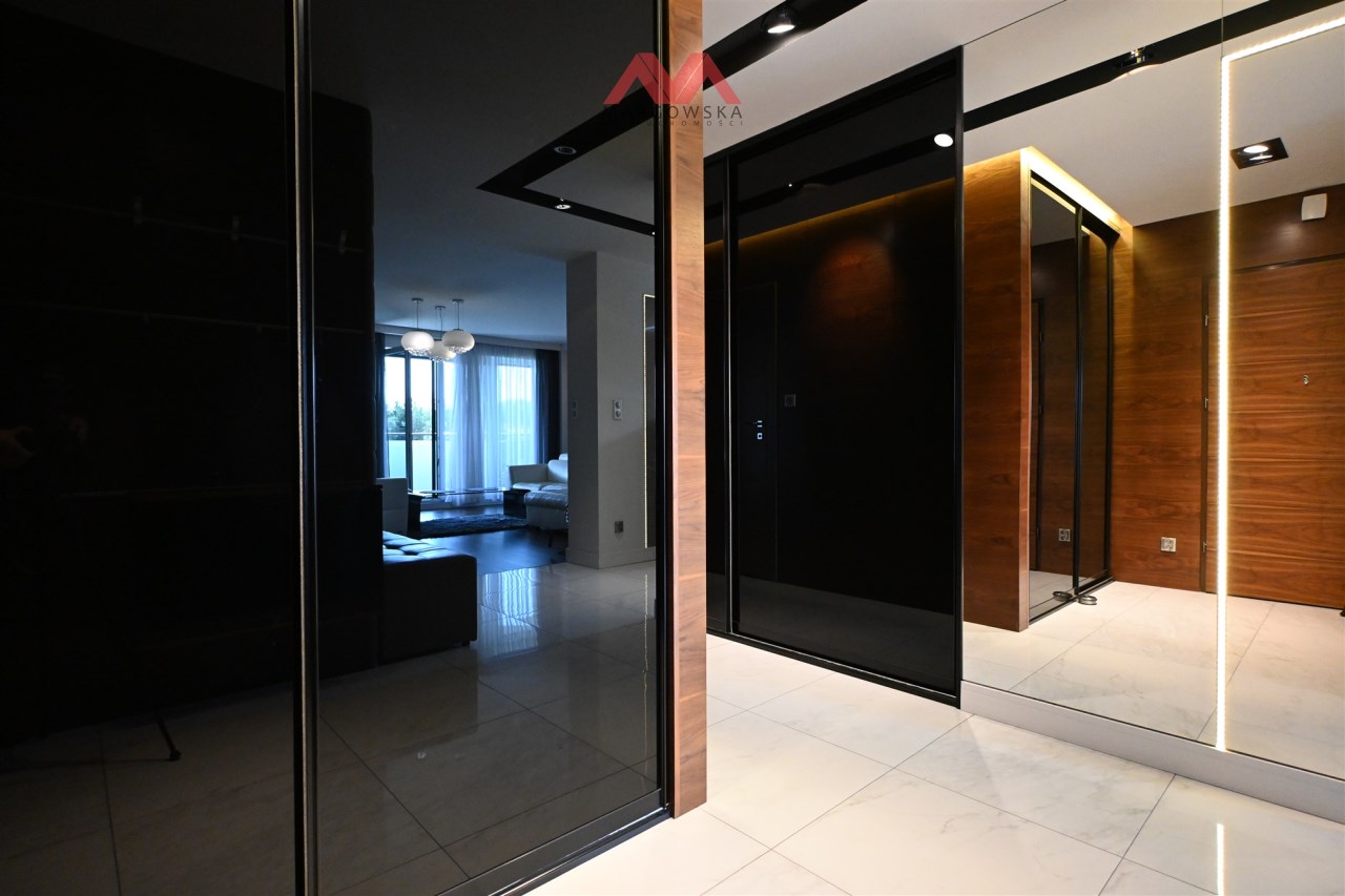 i ponadczasową estetykę. W całym apartamencie wykonano zabudowy na wymiar — od mebli po dekoracyjne zabudowy ścian płytami imitującymi naturalne drewno, a także imponujące lustra, co nadaje wnętrzu elegancki i spójny charakter.
