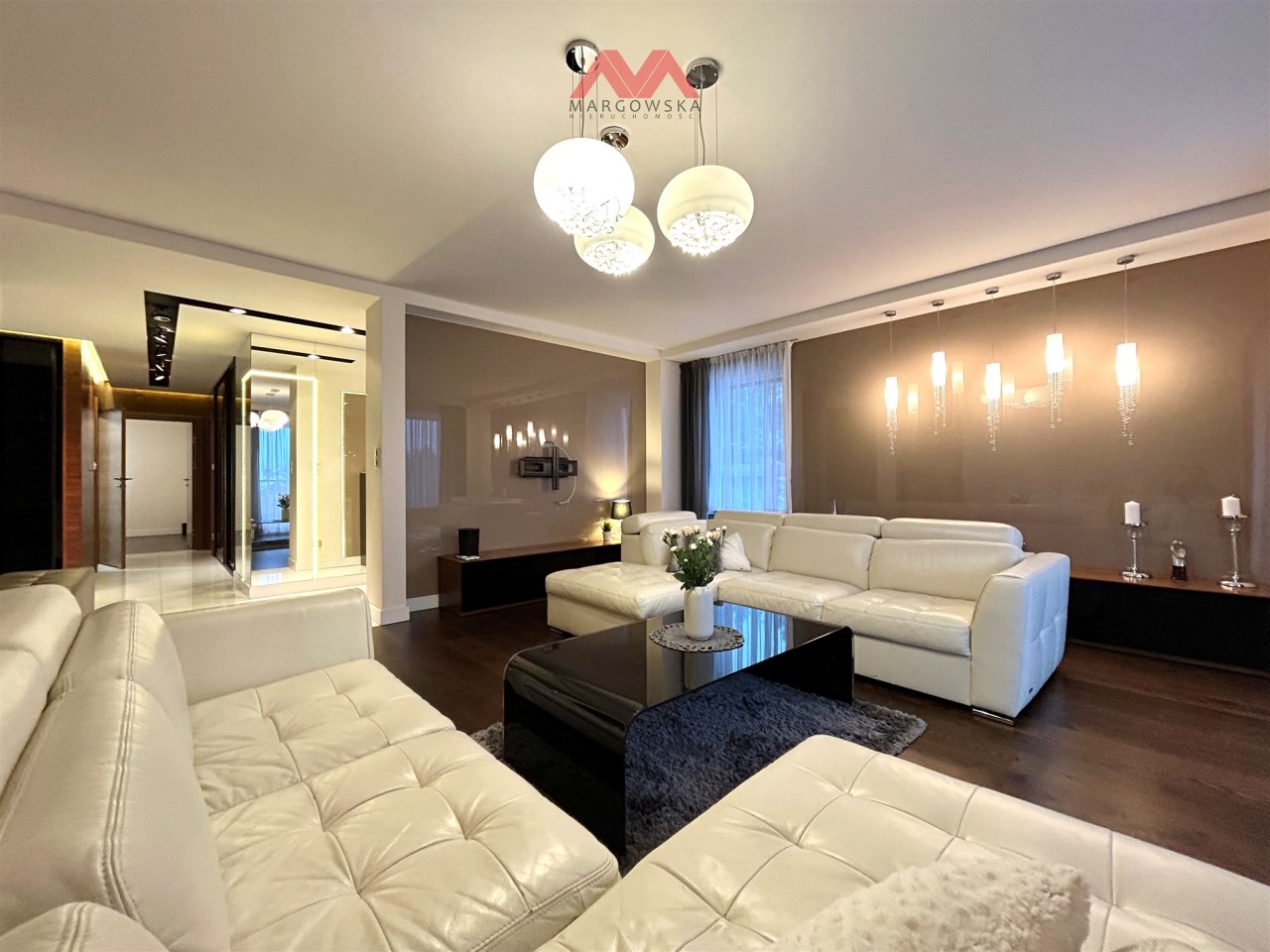 Obecnie w pomieszczeniu znajdują się dwa narożniki, jednak dzięki dużej powierzchni salon daje ogromną swobodę w kreowaniu przestrzeni — od klasycznej strefy wypoczynkowej, przez część reprezentacyjną, po elegancką przestrzeń do spotkań towarzyskich. To wnętrze, które można łatwo dopasować do indywidualnego stylu życia przyszłych właścicieli.
