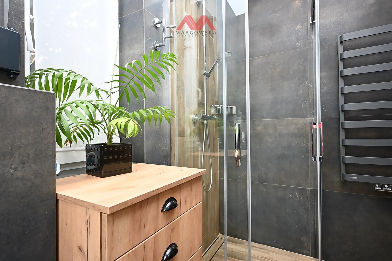 - Łazienka (ok. 4m²) z natryskiem i wc. W łazience dwa okna