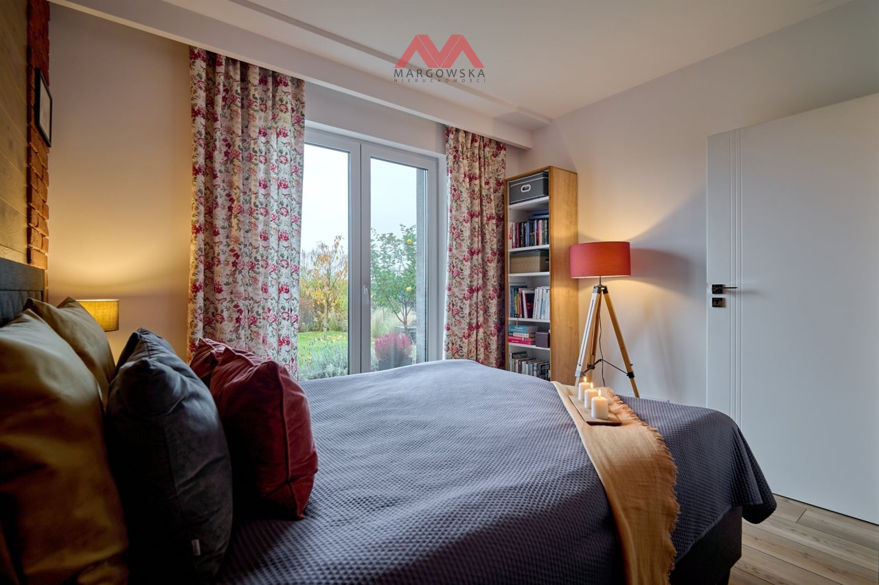 Sypialnia główna (10,10 m2) z wyjściem na ogród, łóżko sypialniane z tapicerowanym wezgłowiem i ścianą wykończoną naturalnym drewnem olejowanym oraz cegłą (łózko, materac, stolik w cenie)