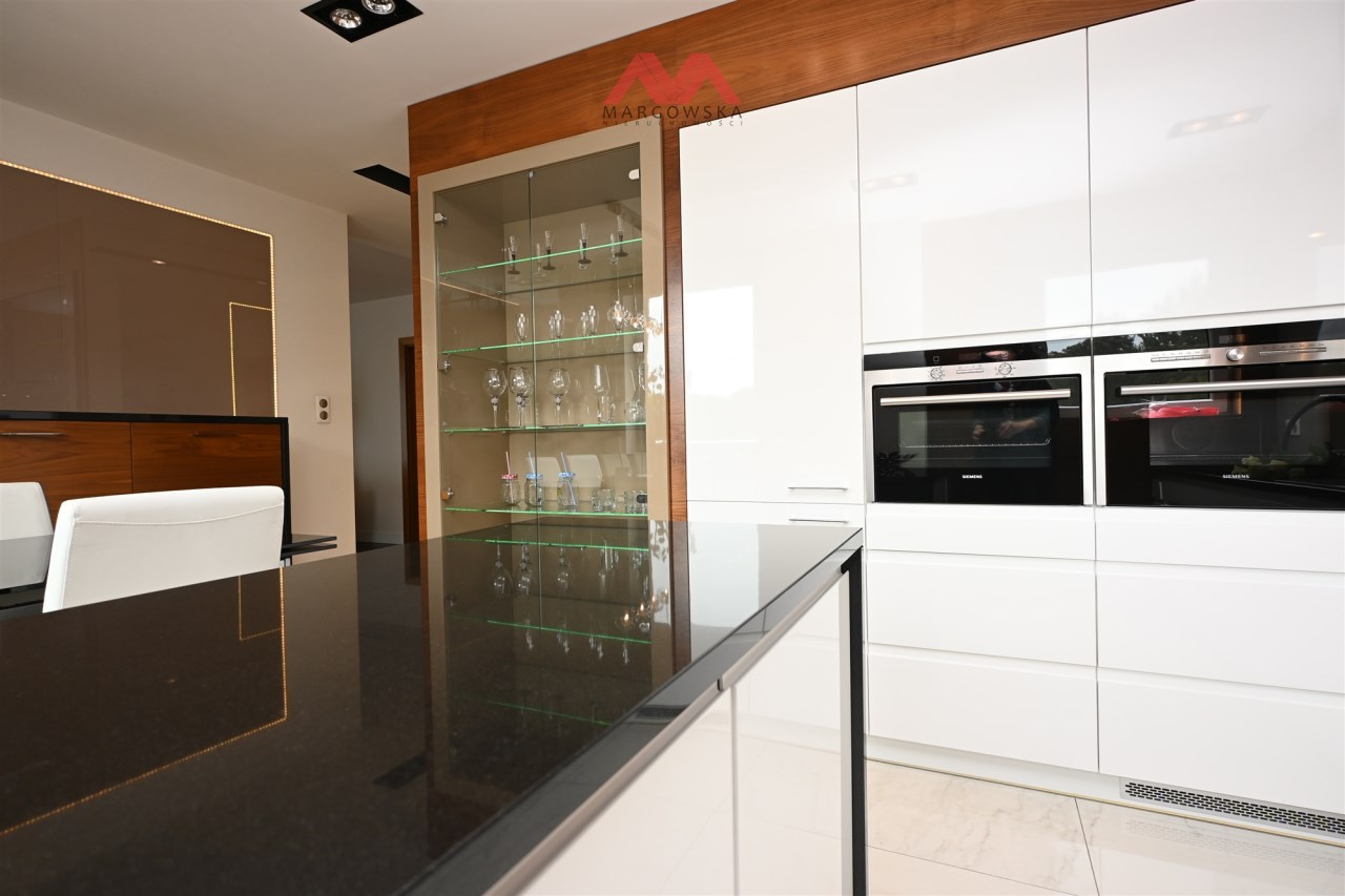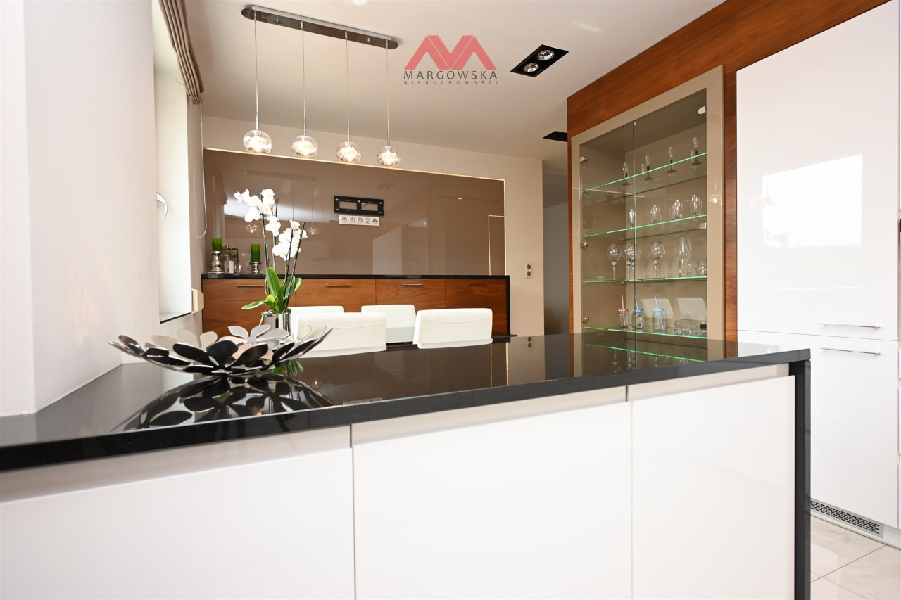 W kuchni –wysokiej klasy zabudowa pod wymiar z blatem z naturalnego granitu oraz pełne wyposażenie w sprzęt AGD (lodówka, piekarnik, płyta grzewcza, okap, zmywarka).